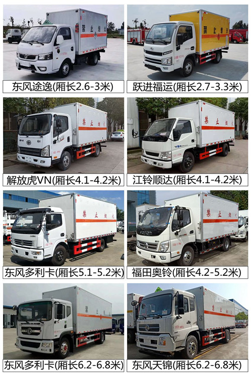 我公司炸藥運輸車-現車車型:躍進福運S80爆破車,原裝助力空調,全柴95馬力發動機,車廂長3250×1675×170mm,額定載質量1700kg藍牌。江鈴順達載質量有1.4噸藍牌和2.55噸黃牌可選,江鈴現款駕駛室已可翻轉,江鈴115馬力發動機,車廂尺寸4200×1850×1800mm,軸距3360,輪胎7.00R16LT防爆胎。東風日產皮卡單排座,電動門窗中控鎖,轎車級貨車,四驅動140馬力2.5排量,適用各種路況,小噸位0.45噸,選裝側門分倉。福田歐馬可爆破車,一排半帶小臥駕駛室,車廂尺寸4700×2000×1800選單排座車廂長5米,康明斯156馬力動力,載質量有5噸和7噸兩個噸位, 10噸爆破車,東風天錦,6米2和6米8的廂長,康明斯210動力,295/80R22.5防爆胎,以上車型均為國六車。法規規定一類爆破車載質量不得超過10噸。