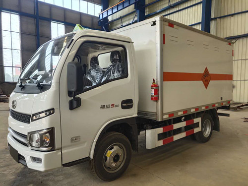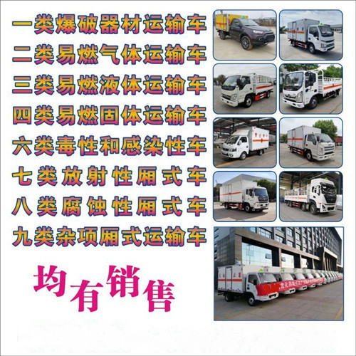按危貨種類分為:1類爆破車、2類氣體氣瓶車、3類易燃液體運輸車、4類易燃固體運輸車、5類氧化性物品廂式車、6類毒性和感染性物品廂式車、7類放射性物品廂式車、8類腐蝕性物品廂式車、9類雜項危險品廂式車、特種翼開啟廂式飛翼車和冷藏車等