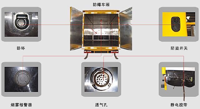 廂體分為兩部分:A:運輸炸藥;B:運輸雷管(防爆罐或防爆箱);C:炸藥,雷管同時運輸(廂體必須隔倉,分倉運輸,加裝防爆罐或防爆箱)。廂體為雙層金屬骨架結構,外部為冷扎鋼板,內壁采用鋁合金板蒙面,夾層為隔熱阻燃材料填充。設置對開門,如需安裝抗暴容器則增開側門,側壁設有防雨功能自然通風窗口,以使廂內外空氣流動,廂體內部做防靜電處理,廂體底部與廂內前部鋪有阻燃導靜電膠板,并與底盤等電位連接,通過車輛后端的導靜電裝置與大地相連,可防止靜電火花的產生和車輛靜電及時釋放,提高爆破器材運輸車的安全性。廂體內部前面和側面裝有固定拉環,與捆綁帶使用捆綁貨物以避免移動,保證安全。