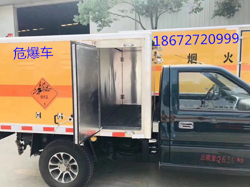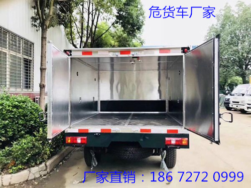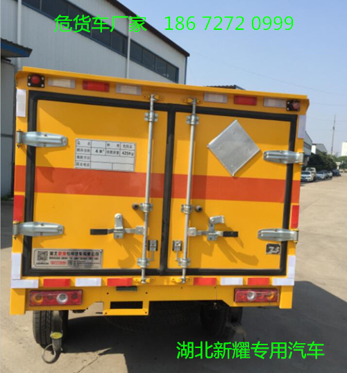 廂體全金屬整體骨架結構,外飾冷軋鋼板(隔熱,防靜電),內飾鋁板(隔熱,防靜電),中間骨架結構(提高廂體強度),所有箱板內部填筑阻燃高強度泡沫板整體高壓粘合鉚接后焊接拼裝成廂型,底板鐵板上鋪設防靜電膠皮(絕緣,導靜電),前臉底部鋁板上加裝靜電防撞膠皮,內飾臥環(固定貨物定位拉環),透氣孔,外部帶通風孔,保持廂體與外部空氣流通,及時與外部空氣交換,確保安全,大梁加裝拖地靜電膠帶,把貨物摩擦靜電導入大地。車輛門框配備防盜報警器,廂內頂部安裝煙霧報警器,前廂板左右立柱安放滅火器,排氣管前置安裝排氣火花熄滅器,駕駛室安裝“危險品”標志燈,車廂外中部粘貼橙色反光帶一周,并在車廂左、右、后安裝“爆炸品”菱形牌3塊,車體后部設置安全告示牌、“危險品”黃色警示牌,后保險杠安裝緩沖加強橡膠塊等。車廂開側門,方便裝卸貨物;可加開隔倉,方便不同性質的爆破物品同車分倉運輸。