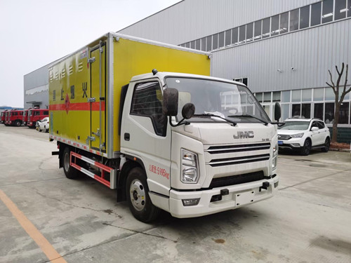 江鈴黃牌寬體炸藥運輸車上戶3噸,國六新排,節油環保,廂體為雙層金屬骨架結構,外部為冷扎鋼板,內壁采用鋁合金板蒙面,夾層為隔熱阻燃材料填充。設置對開門,如需安裝抗暴容器則增開側門,側壁設有防雨功能自然通風窗口,以使廂內外空氣流動,廂體內部做防靜電處理,廂體底部與廂內前部鋪有阻燃導靜電膠板,并與底盤等電位連接,通過車輛后端的導靜電裝置與大地相連,可防止靜電火花的產生和車輛靜電及時釋放,提高車輛的安全性。廂體內部前面和側面裝有固定拉環,與捆綁帶使用捆綁貨物以避免移動,保證安全。