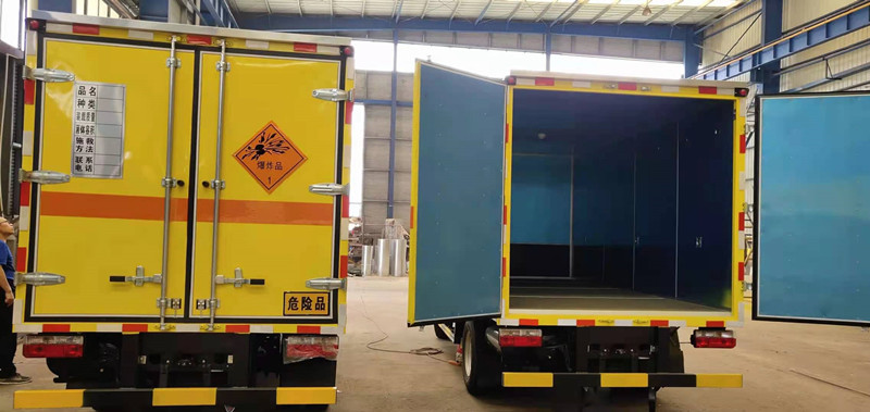 爆破器材運(yùn)輸車廂體外板采用可產(chǎn)生靜電屏蔽效應(yīng)的冷扎鋼板,內(nèi)飾鋁合金,經(jīng)現(xiàn)代工藝復(fù)合而成,廂內(nèi)安裝防燃離子感煙火災(zāi)探測器,前置防撞防靜電膠皮,側(cè)廂安裝固定運(yùn)載物的臥環(huán),側(cè)廂開有通風(fēng)口,前廂板裝有2只滅火器,排氣管前置尾端安裝排氣火花熄滅器(防火罩),車架安裝導(dǎo)靜電橡膠拖地靜電帶2條,駕駛室安裝危險(xiǎn)標(biāo)志燈,身側(cè)面及后部粘貼橙色反光標(biāo)識,1類爆炸品菱形標(biāo)識,車體后部設(shè)置安全告示,車箱體兩側(cè)貼"嚴(yán)禁煙火", 門上安裝防盜報(bào)警器。箱體顏色可選。
