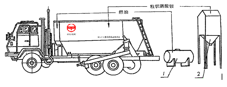 柴油貯罐及泵送裝置,將燃油送入車上油箱內,所需原料裝入車后,裝藥車駛入爆破